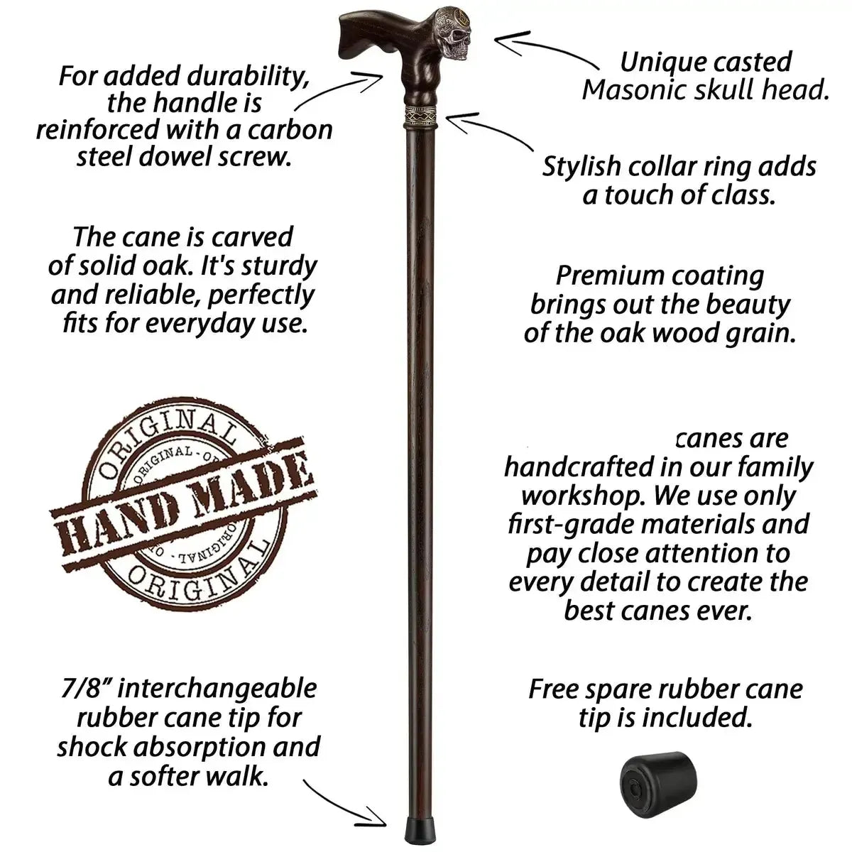 Freemason Skull Walking Cane – Handcrafted Oak Shaft, Masonic Symbol Head